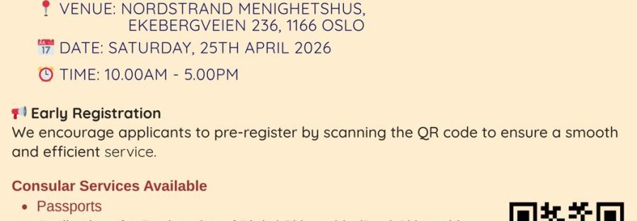 This outreach initiative will take place on Saturday, 25 April 2026, from 10:00 AM to 5:00 PM at Nordstrand Menighetshus, Oslo. A wide range of services will be available, including passport-related services, citizenship and birth registrations, driving license renewals, attestations, affidavits, and legalization of documents.