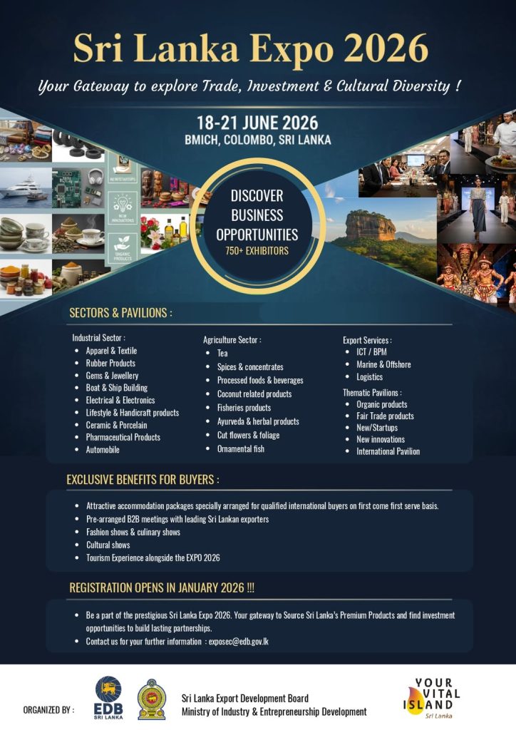 Organized by the Sri Lanka Export Development Board (EDB) under the Ministry of Industry and Entrepreneurship Development, Sri Lanka Expo 2026 is designed to reposition the country as a preferred trade, investment, and tourism destination in Asia.