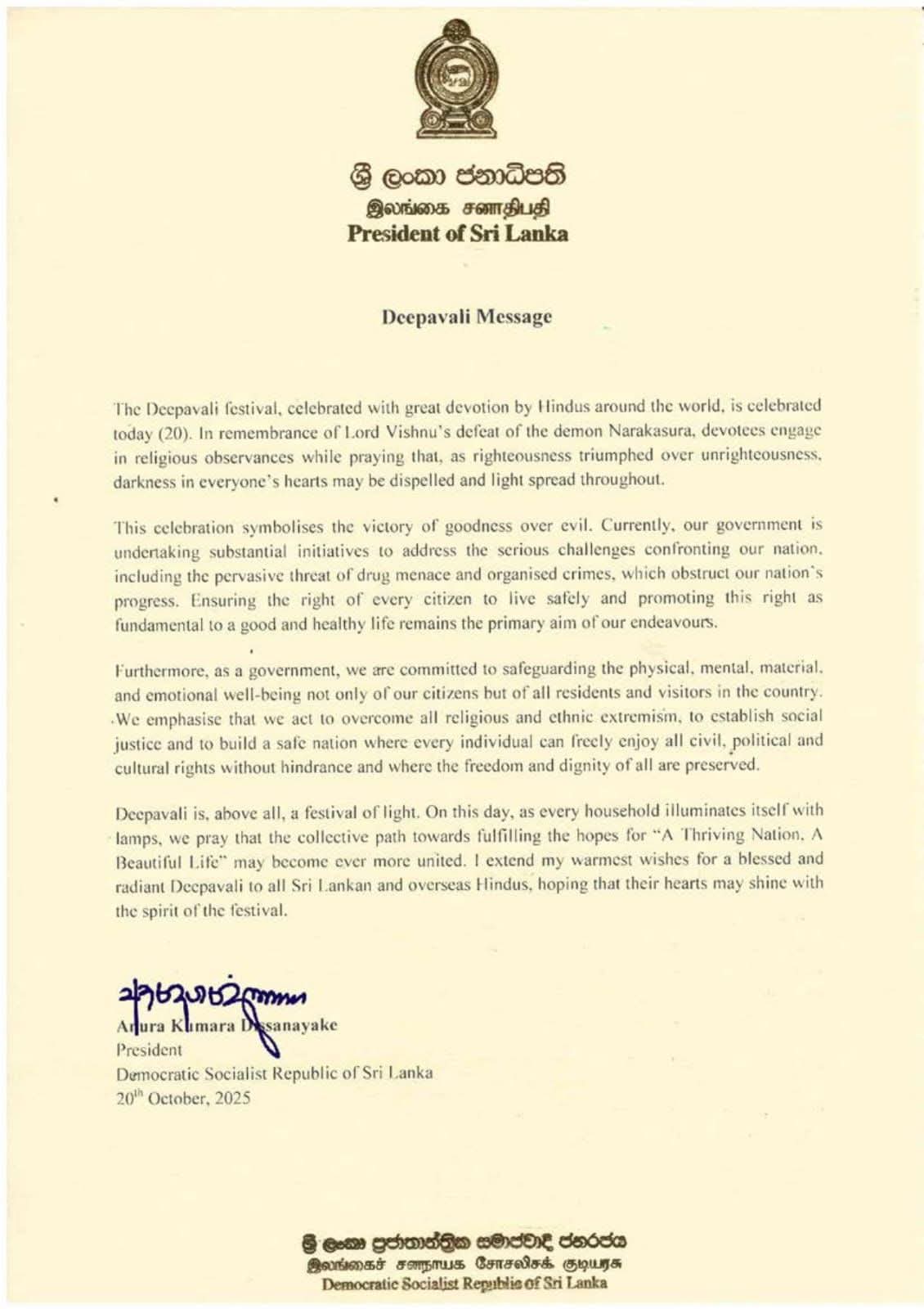 Deepavali Day Massage of H E the President Anura Kumara Dissanayake